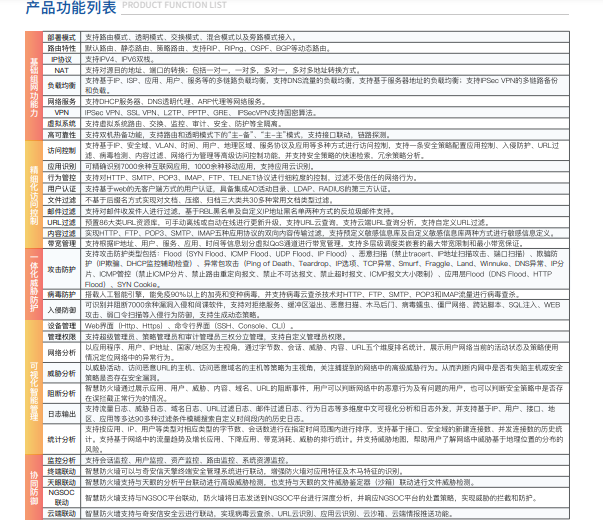 商品属性 [类型] 复合型防火墙 [机箱] 1U [电源] 单电源 [端口规格] 电口 [插槽配置] 8 [整机吞吐率] 2Gbps [并发连接数] 100W [新建连接数] 2万/秒 [入侵防护功能] 支持 [防病毒功能] 支持 [VPN功能] 支持 [APT防护] 支持 [协调联动] 不支持 [详细配置] 防火墙系统基础组件;含应用控制11, URL过滤11, 病毒防护11, 入侵防御11, 威胁情报检测11, IPSec VPN11, SSL VPN等功能 [国家信息安全产品认证证书编号] 2021162301000854 [销售许可证证书编号] 0402221396 [产品尺寸(mm)] [重量(kg)] [包装清单] [售后服务] 含一年硬件维保服务,1年病毒防护特征库升级服务